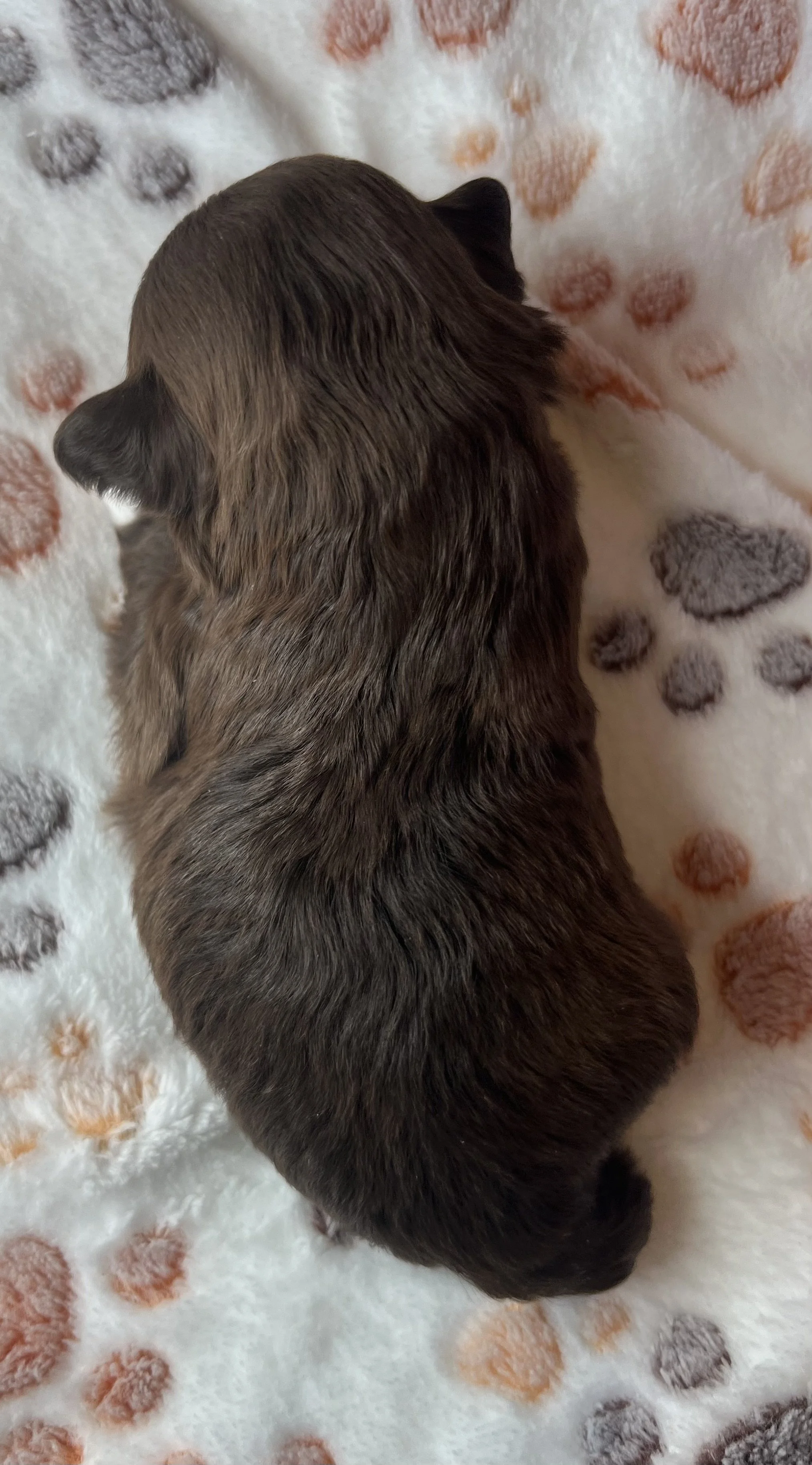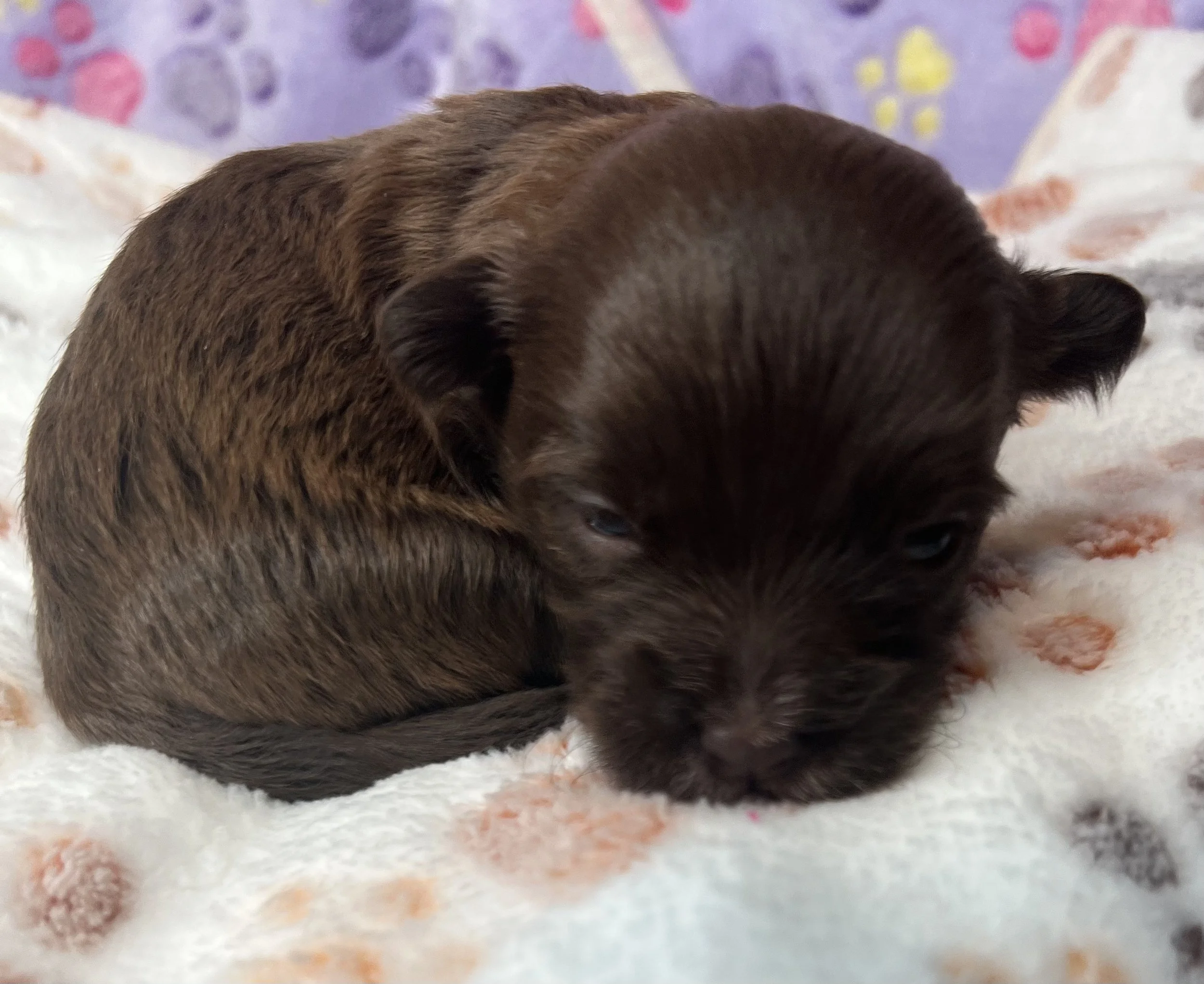 Brownie is a 3-week-old female Havanese being lovingly raised in our home. She has a beautiful rich chocolate coat with adorable white-dipped toes and a sweet white marking on her chin, giving her a very charming and unique look. At this stage, she spends most of her time eating and sleeping as she grows and develops. Her personality is just beginning to emerge, and we look forward to watching her blossom over the coming weeks.
